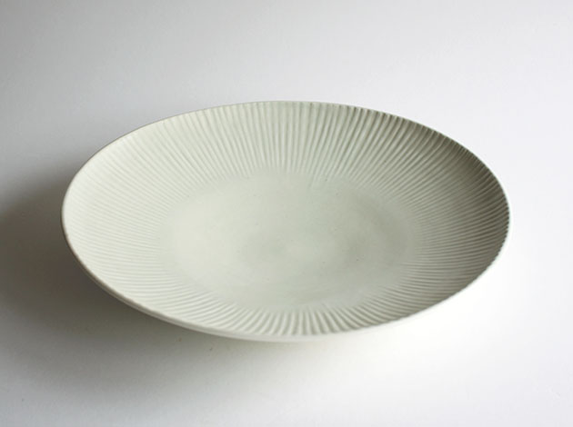 放射状のしのぎが美しいシンプルな8寸皿。のびのびとしたサイズ感が心地よい。ワンプレートディッシュとして、盛り皿として、またパスタ皿としてオールラウンドに活躍します。