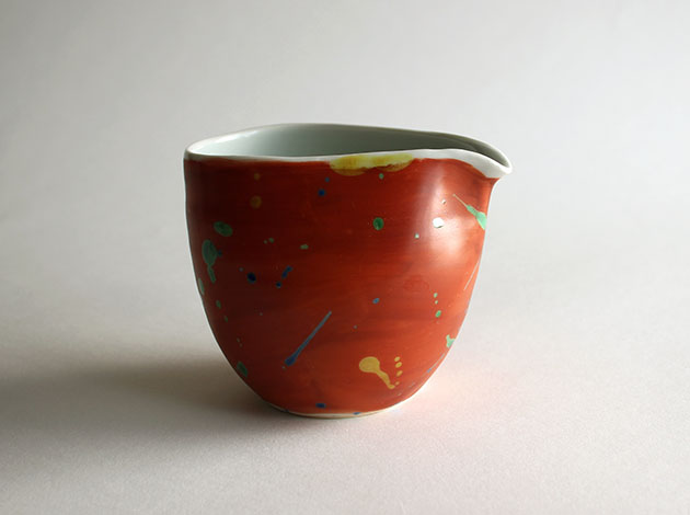 70歳を過ぎたいまも変わらぬ天真爛漫な絵付けで、うつわ好きを魅了する古川章蔵さん。華やかで愛らしい赤巻きの片口。酒席をより楽しくしてくれそうです。