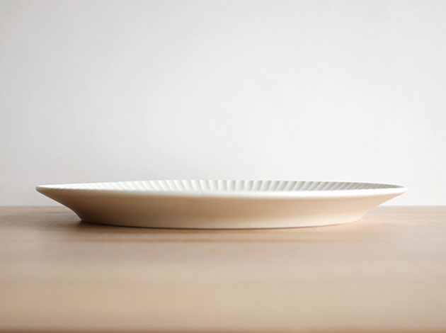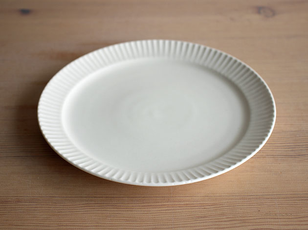 微かに光沢のあるマットな白が、美しくスタイリッシュなシノギプレート。メインディッシュに、パスタ皿に、またフラットなので前菜の盛り合わせなどにもぴったりです。